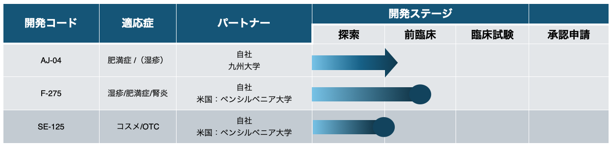 Abrax Japan はパートナーとの共同開発および自社開発を通じて製薬大手に匹敵する豊富な創薬開発パイプラインを保有しています。